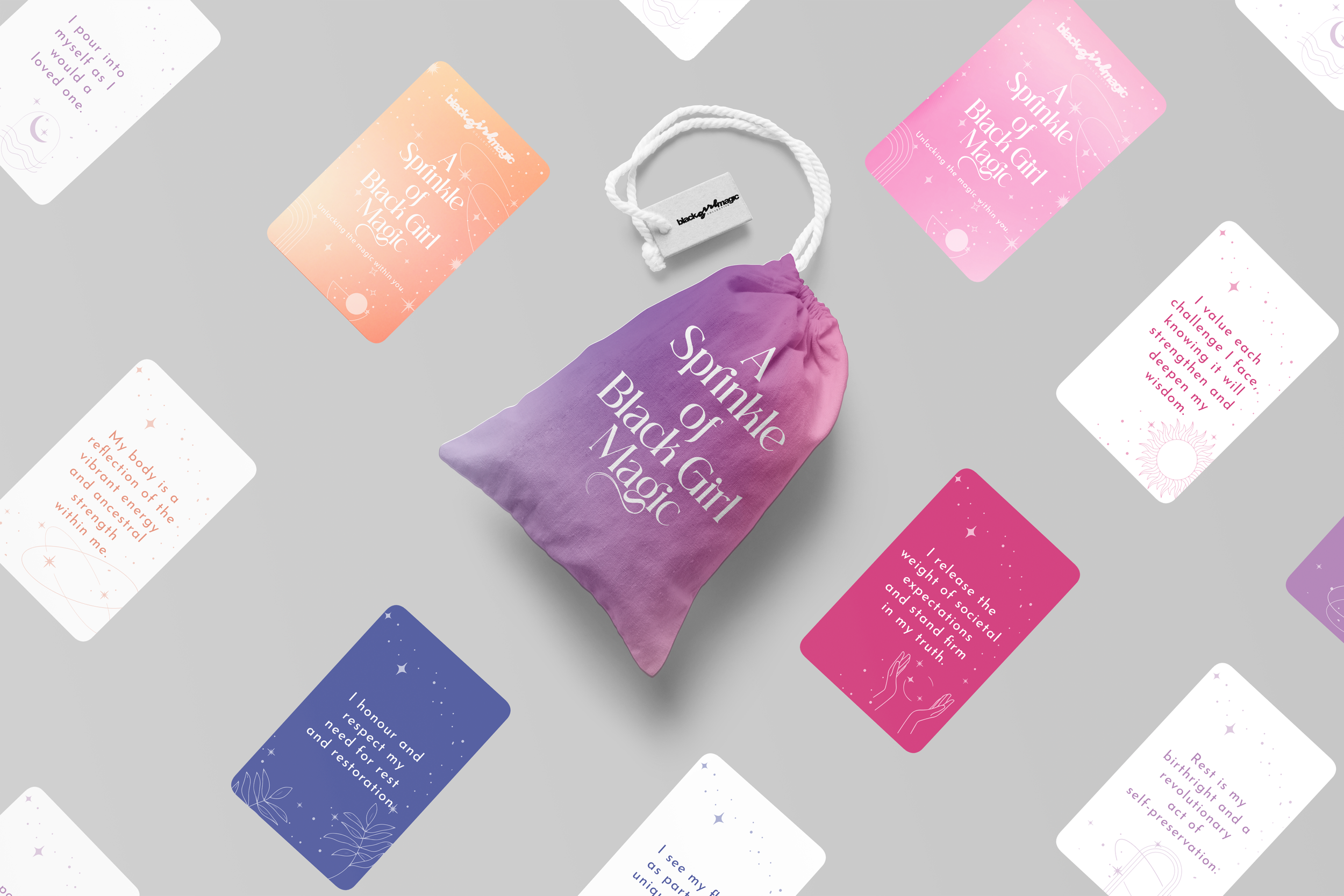 Inspired by the book A Year of Black Girl Magic, A Sprinkle of Black Girl Magic Affirmation Cards deck and matching box designs. Created for client Eboni Morgan founder and CEO of The Black Girl Magic Collective.